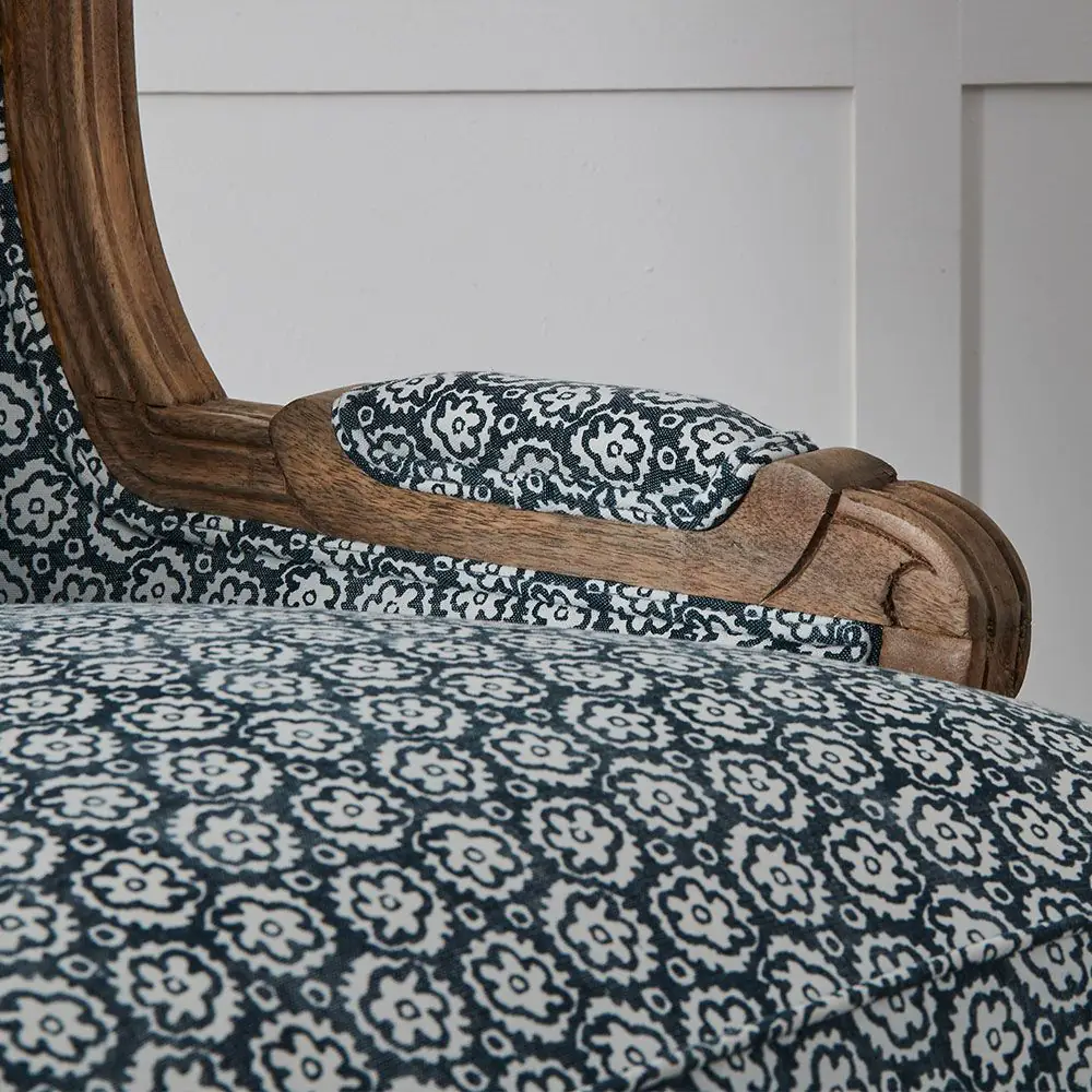 This Khadi armchair is sure to generate some excitement. It’s a little less serious than the French armchair and the jaunty printed daisy fabric will suit any decor. The frame is beautifully crafted from sustainable mango wood, and left with a raw, natural finish as a beautiful complement to the cotton fabric. The cushioning is a mix of top quality, dense foam encased in polyester fibres for added comfort.